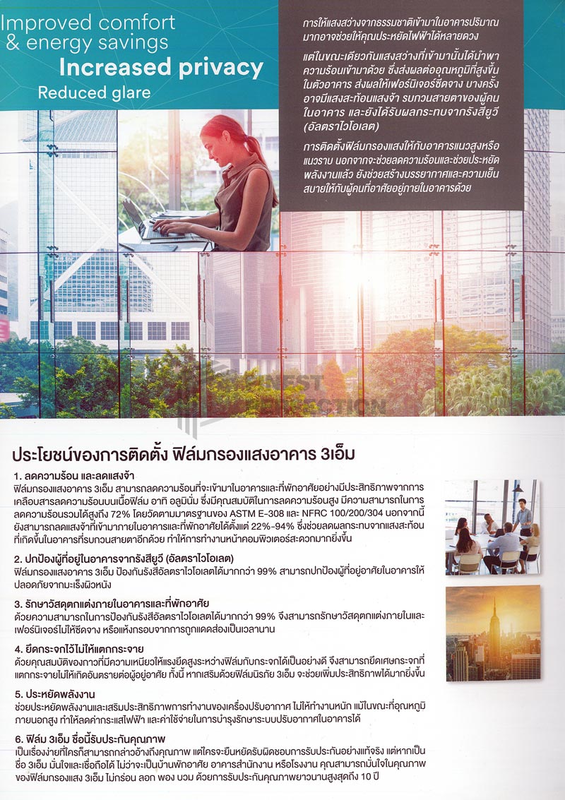 สัมผัสประสบการณ์ที่เหนือกว่าด้วย ไนท์ วิชั่น ซีรีส์ ฟิล์มกรองแสงโทนสีใสธรรมชาติ ที่ไม่เพียง สะท้อนแสงจ้าและความร้อนจากภายนอกได้สูง ช่วยให้บ้านและอาคารของคุณเย็นสบาย ประหยัดพลังงาน และเพิ่มความเป็นส่วนตัวในเวลากลางวัน แต่ยังโดดเด่นด้วยเทคโนโลยี ลดการสะท้อนแสงภายในต่ำ แก้ปัญหาฟิล์มทั่วไปที่ทำให้คุณมองเห็นเงาสะท้อนของตัวเองในกระจกตอนกลางคืน ผลลัพธ์คือ คุณสามารถชื่นชมทิวทัศน์ภายนอกได้อย่างคมชัด สวยงาม แม้ในยามค่ำคืน ไม่ว่าจะเป็นแสงไฟระยิบระยับของเมือง หรือความงามของธรรมชาติยามราตรี ก็ไม่มีอะไรมาบดบัง รับประกันคุณภาพสินค้า 10 ปี